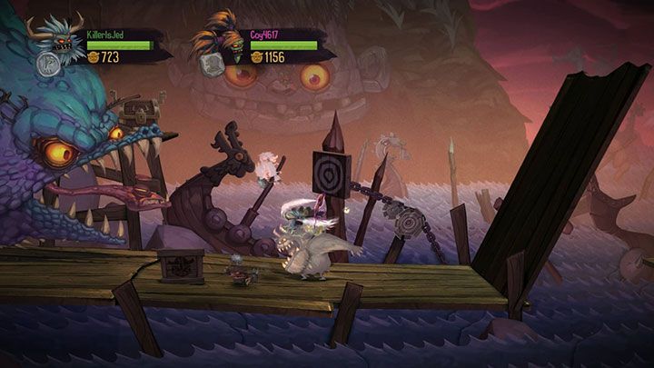 僵尸维京 支持4人合作,游戏讲述是你和你小伙伴为了寻找Odin丢失的眼睛而踏上冒险征程。每一位维京拥有独特能力。比如视频中演示的,有个家伙可以变身成章鱼维京,还有一个将自己呕吐物当做子弹的女维京。